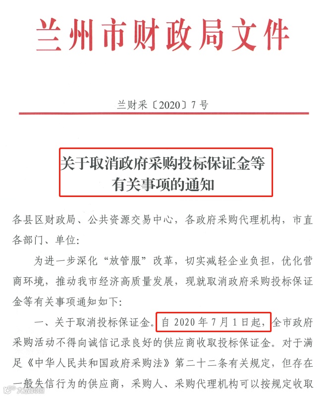 兰州:自2020年7月1日起,取消政府采购投标保证金。