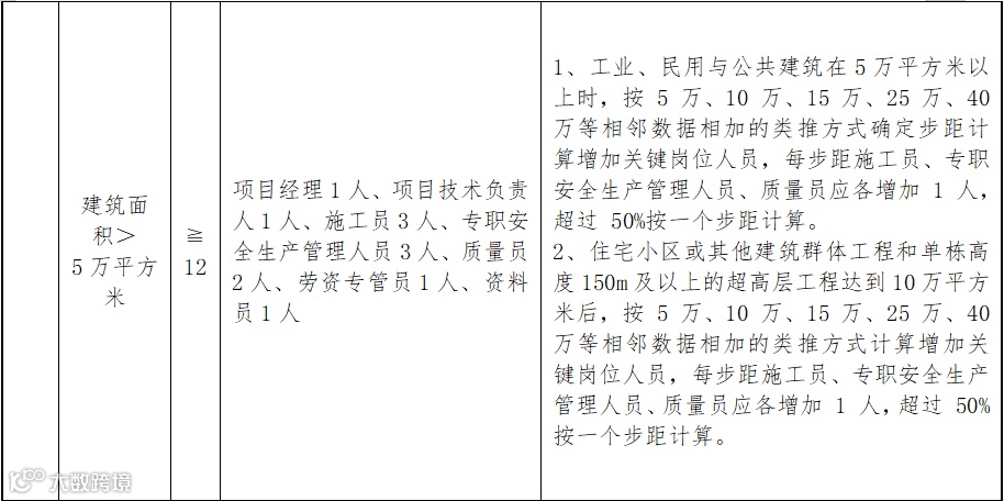 3.对于复杂的体育场所、综合性工程以及工期较紧、多班施工作业的工程,在以上配备标准基础上应适当增加施工员、质量员、专职安全生产管理人员人数。