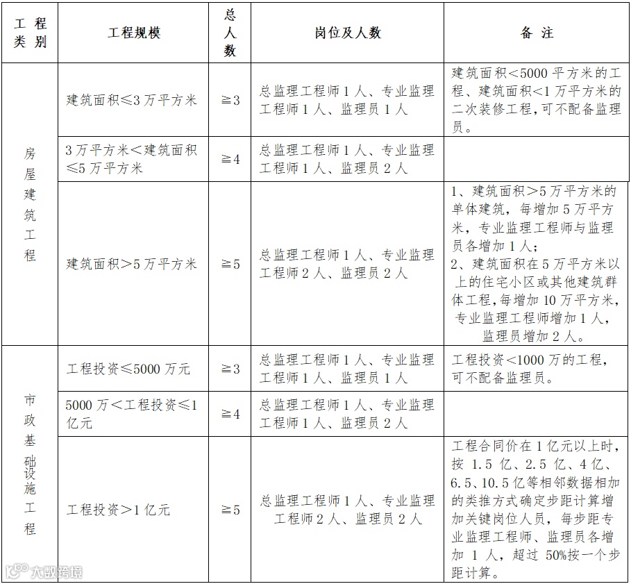 注:1.此标准为关键岗位人员最低配备标准。监理单位可以任命专业监理工程师或监理员兼职负责安全监理、测量复核和见证取样工作。