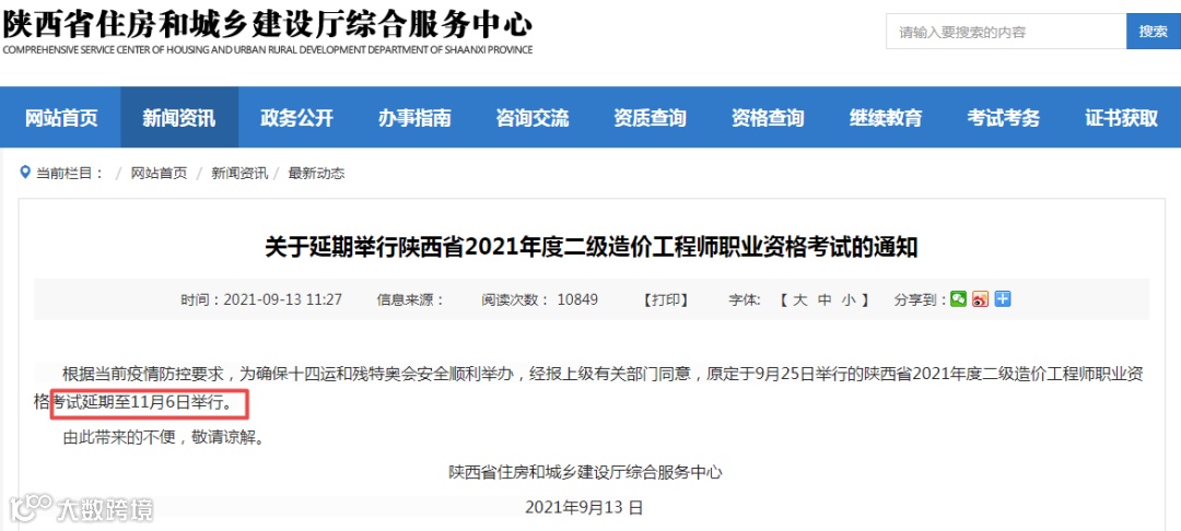 根据当前疫情防控要求,为确保十四运和残特奥会安全顺利举办,经报上级有关部门同意,原定于9月25日举行的陕西省2021年度二级造价工程师职业资格考试延期至11月6日举行。