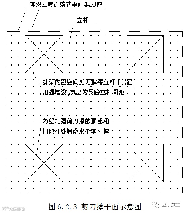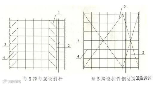 (7)斜拉杆布置要求:在规范要求的允许搭设高度的24米内,沿架体外侧纵向每5跨每层应设置一根竖向斜拉杆或每5跨间应设置扣件钢管剪刀撑。