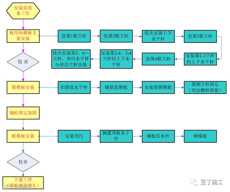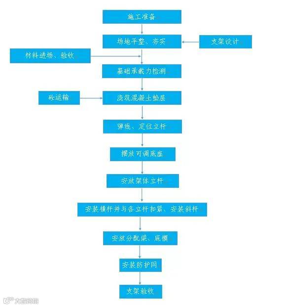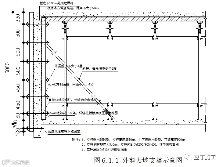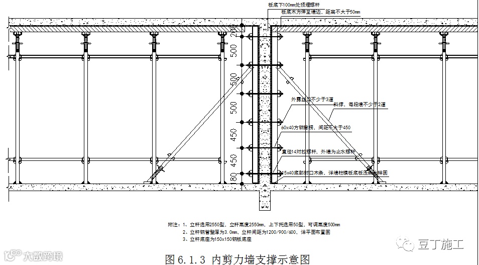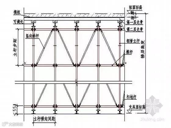 4)材料进场检验及验收要求。包括:支模架的搭设、拆除施工工艺;支模架连接方式要求;支模架与柱、梁的拉结要求;架体基础做法或下部支模架的保留要求;支模架检查和验收要求;混凝土浇捣要求;支模架监测监控措施。