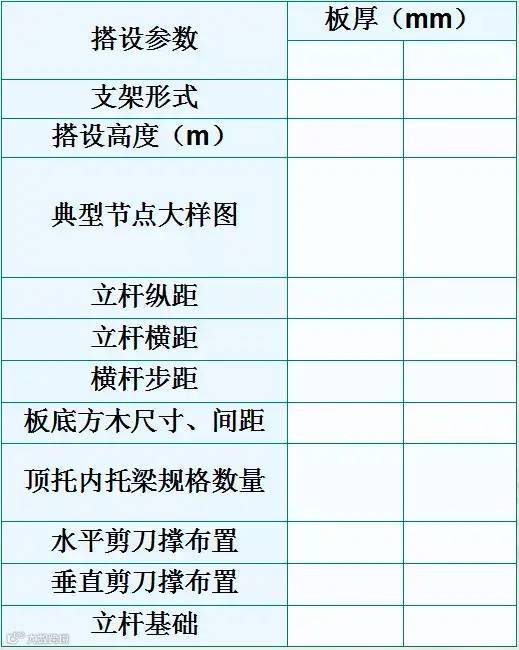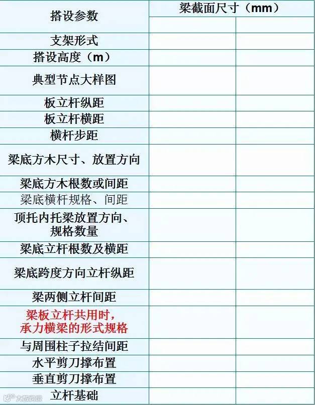2)根据选定的支模架形式,列搭设参数表(应按照梁大小、板厚度合理分类并列出搭设参数)。