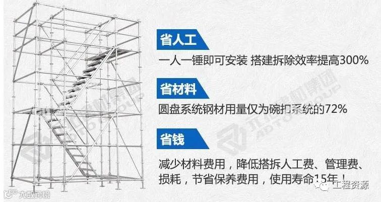 ③材料用量省。不需使用扣件,比传统脚手架节省一半钢材,架体更牢固更稳定。