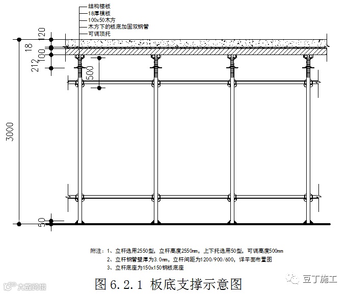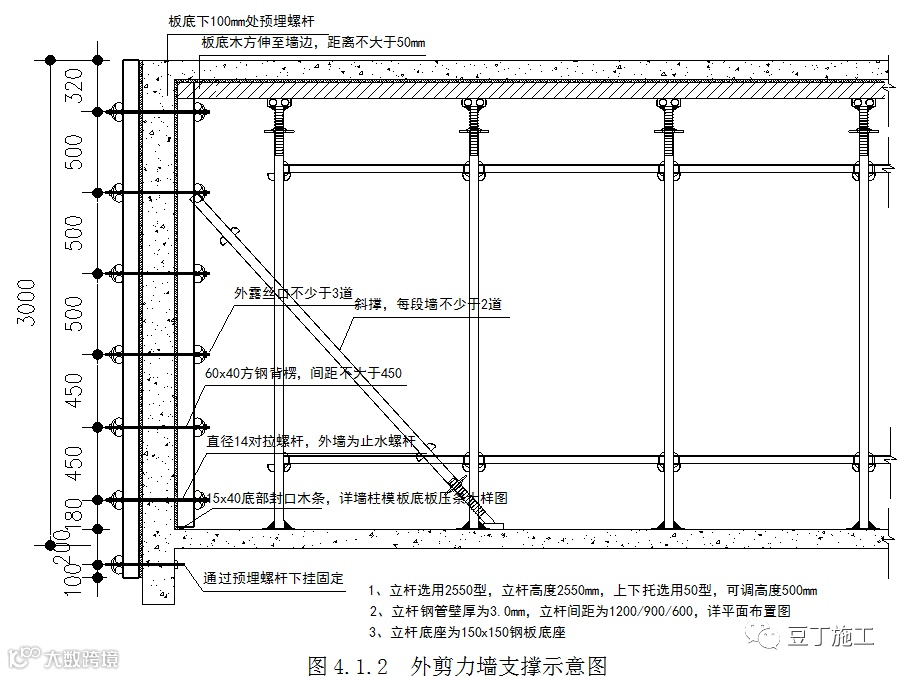 (4)可调底座要求:可调底座调节丝杆外露长度不大于300mm,扫地杆最底层水平杆距离地面高度不应大于550mm。