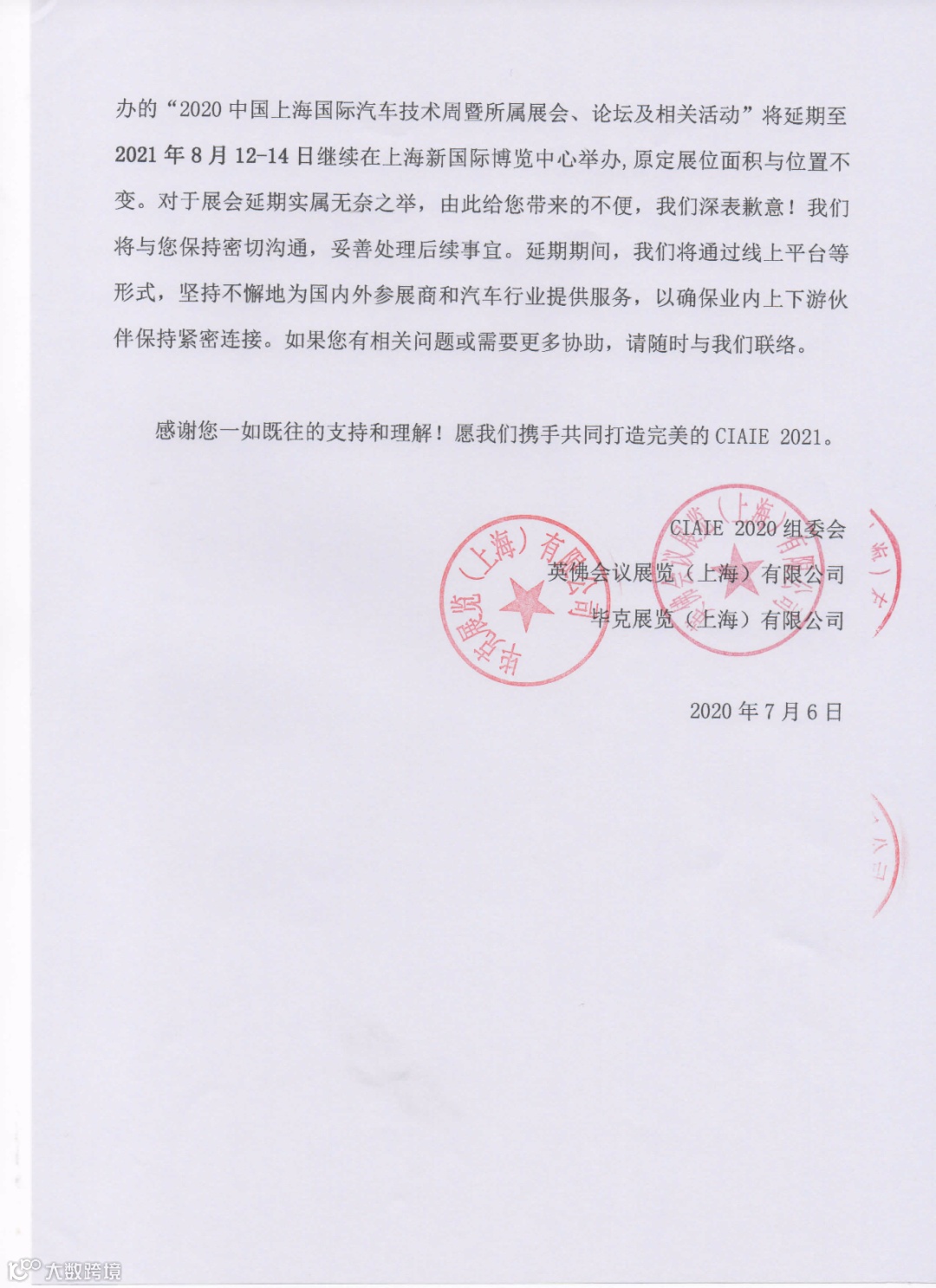 对于展会延期实属无奈之举,由此给您带来的不便,我们深表歉意!我们将与您保持密切沟通,妥善处理后续事宜。延期期间,我们将通过线上平台等形式,坚持不懈地为国内外参展商和汽车行业提供服务,以确保业内上下游伙伴保持紧密连接。如果您有相关问题或需要更多协助,请随时与我们联络。