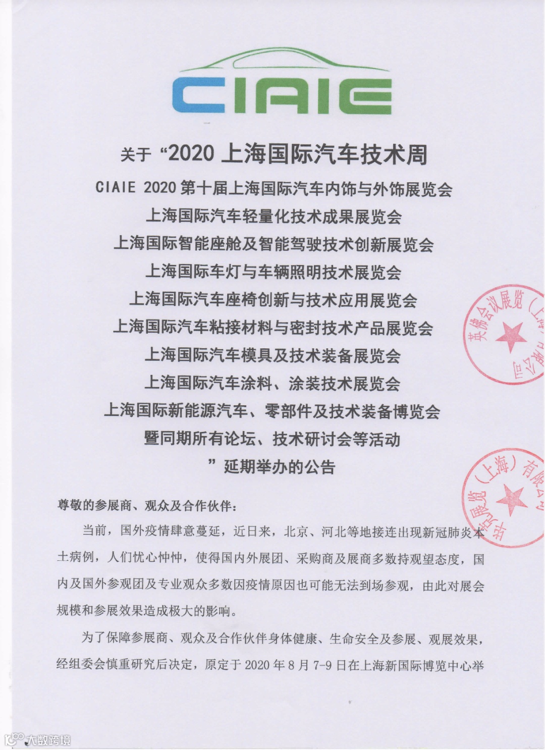 为了积极响应国家关于疫情防控工作的要求,保障所有展商及观众的身体健康和生命安全,以保证良好的参展和观展效果,经组委会慎重研究后决定,原定于2020 年8月7-9日在上海新国际博览中心举办的“2020中国上海国际汽车技术周暨所属展会、论坛及相关活动”将延期至2021年8月12-14日继续在上海新国际博览中心举办,原定展位面积与位置不变。