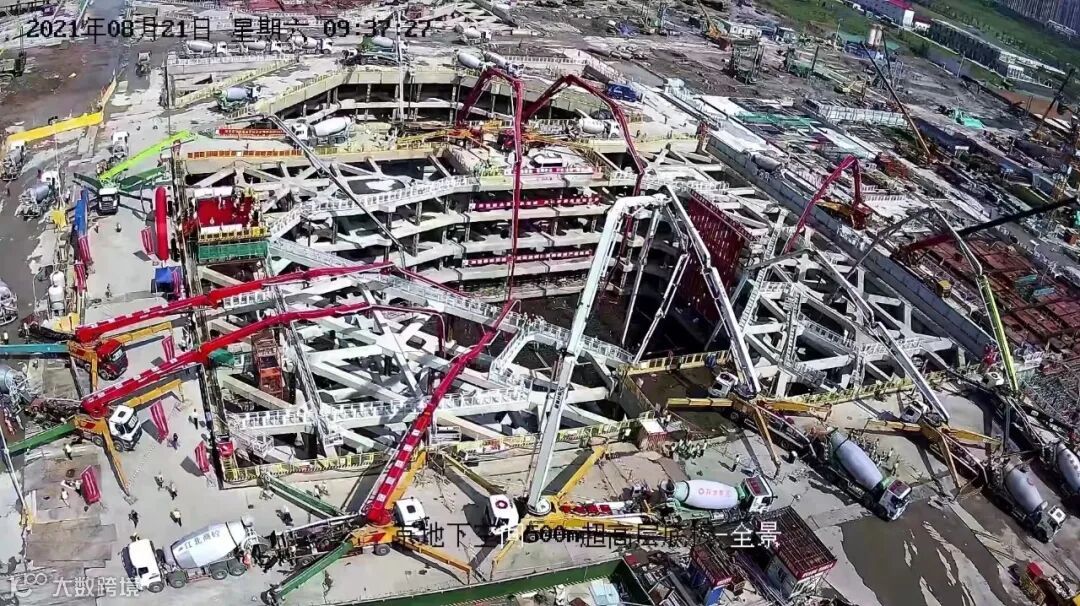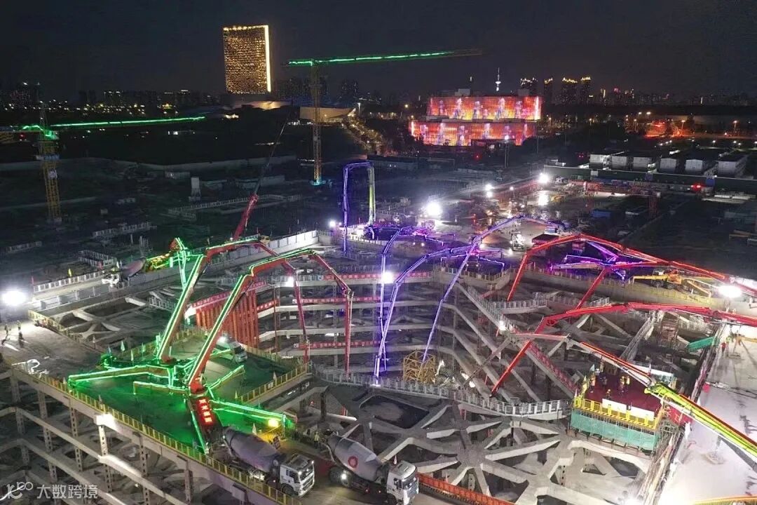 回首五个月之前的2021年8月,绿地金茂国际金融中心开始进行大底板混凝土浇筑,十几台泵机如擎天巨柱一般不舍昼夜的奋战,十辆混凝土搅拌车千帆竞发,那般生机勃勃的景象犹在眼前。