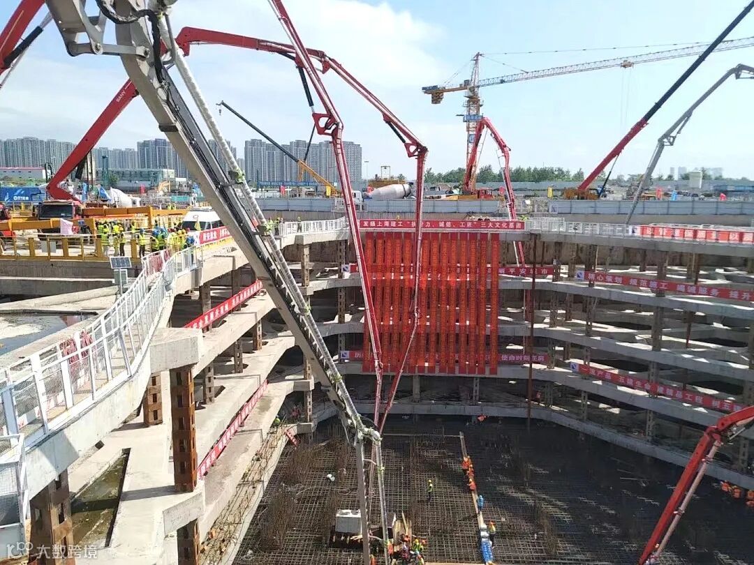 2021年8月23日下午,由上海建工五建集团承建的499.8米超高层南京绿地金茂金融中心顺利完成了33800立方的超大体积大底板混凝土浇筑施工,混凝土一次性连续浇筑规模在上海建工史上位列前位,这也标志着这座国内规模最大、最复杂的单体地下空间项目建设正在全速前进。