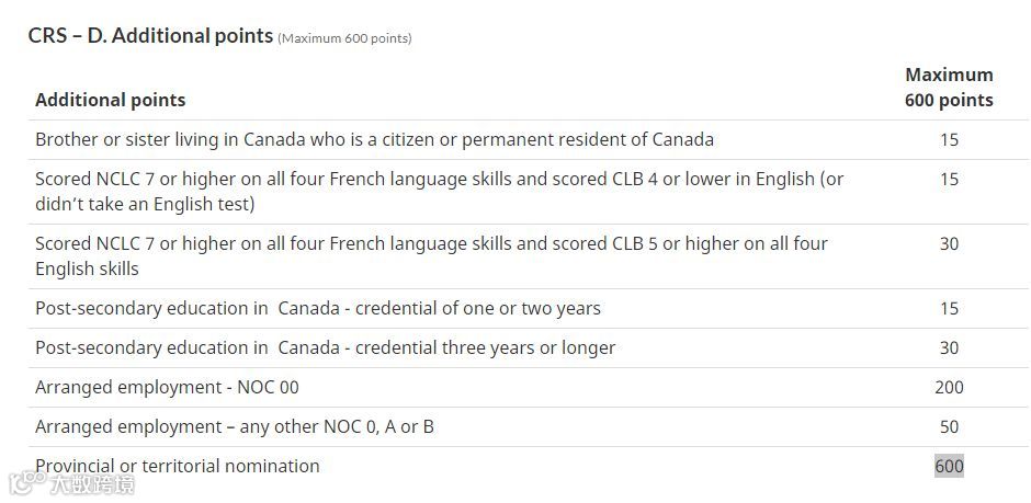 虽然D板块叫“额外加分”,但是该项的最高的分值是所有板块中最高的600分。在至今为止的116次筛选中,除了2016年11月30日第48轮和2017年11月1日第75轮专门针对省提名PNP申请人的筛选超过了600分以外,所有的其他筛选都远低于600分。也就是说,如果能在D板块获得高分,那么申请人就算是移民成功了一半了。