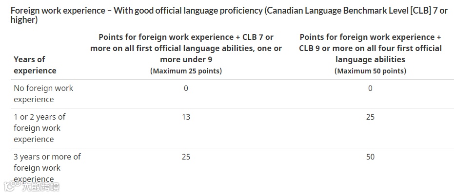 本项最高加成分为50分。申请人如果需要获得最高50分的加分,需要有3年及以上的海外(加拿大之外的)工作经验和英语或法语能力至少需要达到CLB9的水平(对应英语的雅思G类的得分为听读写说8777)。