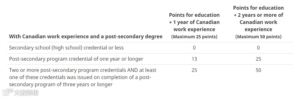如果一个申请人为硕士学历(2个高中以上的学历, 本科+研究生),他同时具有2年加拿大本地的工作经验,那么他的在该项的得分为50分。