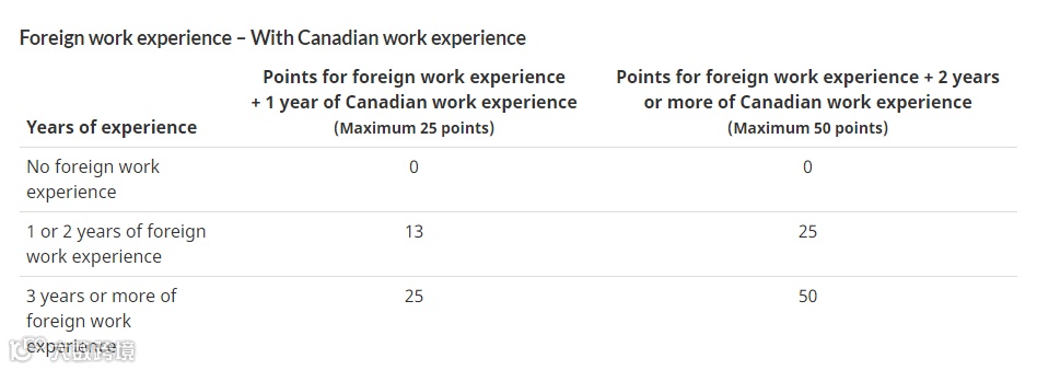 本项加成分最高分为50分。 如果申请人想要获得最高分,需要具备3年的海外工作经验以及2年的加拿大本地工作经验。若果申请人只有1年的海外工作经验以及1年的加拿大工作经验,那么他只能获得13分的加分。