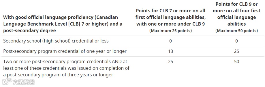 这项加成分的最高分值为50分,想要获得50分的加分,申请人需要有至少2个高中以上的学历,其中一个学历需要有三个学年或以上,且申请人的英语或法语能力至少需要达到CLB9的水平(对应英语的雅思G类的得分为听读写说8777)。