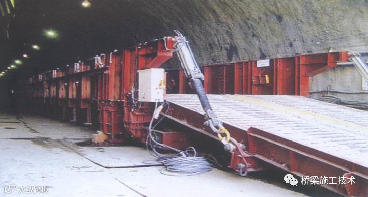 c.根据技术交底的中线和标高铺设衬砌台车轨道,要求使用标准枕木和鱼尾板;轨距与台车轮距一致,左右轨面高差<10mm。启动电动机使衬砌台车就位。涂刷脱模剂。