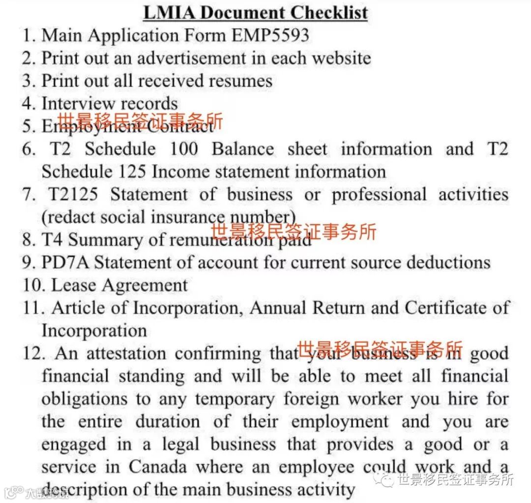 世景Sir:LMIA是加拿大企业雇佣外国人必须向加拿大劳工部门申请的准雇函。加拿大劳工部门收到申请后, 会评估企业的运营、盈利、过往雇佣情况以及意向雇佣岗位在该地区的时期稀缺情况。只有劳工部认为引入外来务工人员不会负面影响到加拿大本地公民和永久居民就业的情况时才会给予下发LMIA (labour market impact assessment). 申请这个LMIA需要加拿大企业做的工作非常多, 对企业的经营年限和运营状态都有比较高的要求, 不是什么企业都能申请的。我一会发一个加拿大企业要雇佣外国人需要申请LMIA的基本清单给你看一下, 我们平时做的真正准备材料比这个清单上的多很多。