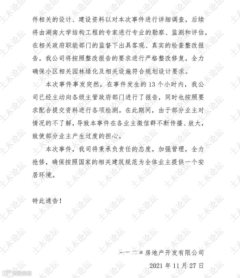 坍塌后,建设单位发布紧急通报,极力澄清车库坍塌不会影响主楼结构安全,通报称第一时间上报政府相关监管部门,随即住建部门委派了湖南大学结构专家去事发项目进行了实地勘察;