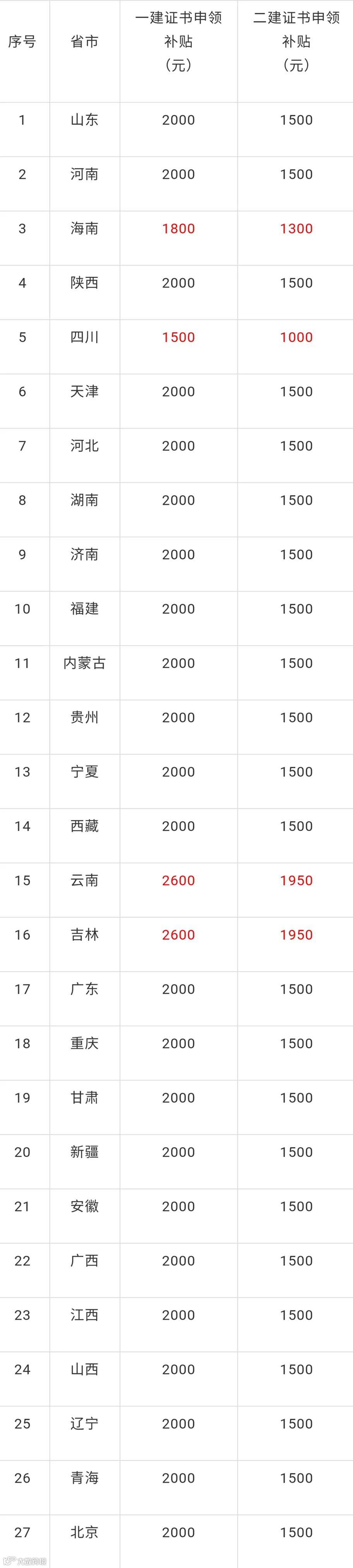 目前,已有27地公布补贴申领相关通知。能领建造师补贴的省市有: