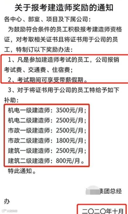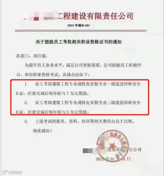 大致意思是鼓励员工考证,考取一建和安全B证且完成注册的,每年奖励7万元;考取二建证书和安全B证且完成注册的每年奖励5万元。