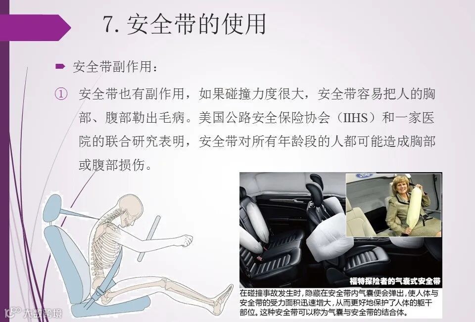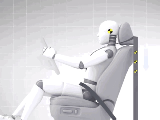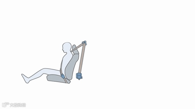 汽车碰撞事故发生时,安全带起作用,锁止机构开始工作,安全带被锁紧,而不能自由地从卷收器中抽出,从而将乘员“束缚”在座椅上,力求使乘员的头部、胸部不至于向前撞到转向盘、仪表板及挡风玻璃上,减少乘员发生二次碰撞的危险,同时避免乘员在车辆发生滚翻等危险情况下被抛离座椅。