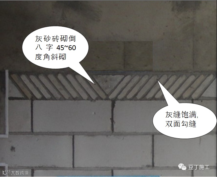 ●墙体顶砖采用灰砂砖倒八字45~60度角斜砌,加气块砌体砌筑完成7天后方可砌筑顶砖。