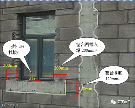 ●窗台砼压顶宽度同墙宽,厚度为120mm,砼强度为C20,构造配筋,两端入墙长度200mm,砼压顶面层由里向外2%找坡;压顶砼浇筑应密实,表面质量应平整无明显蜂窝麻面;窗台标高应准确。