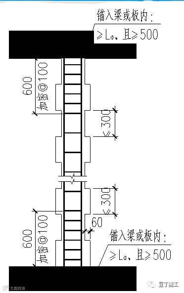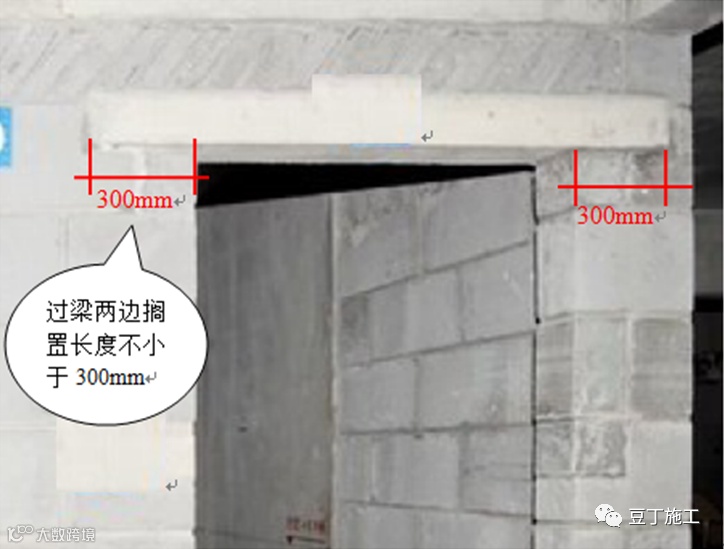 ●洞口(大于600mm)的过梁:同墙宽,入墙不少于300mm