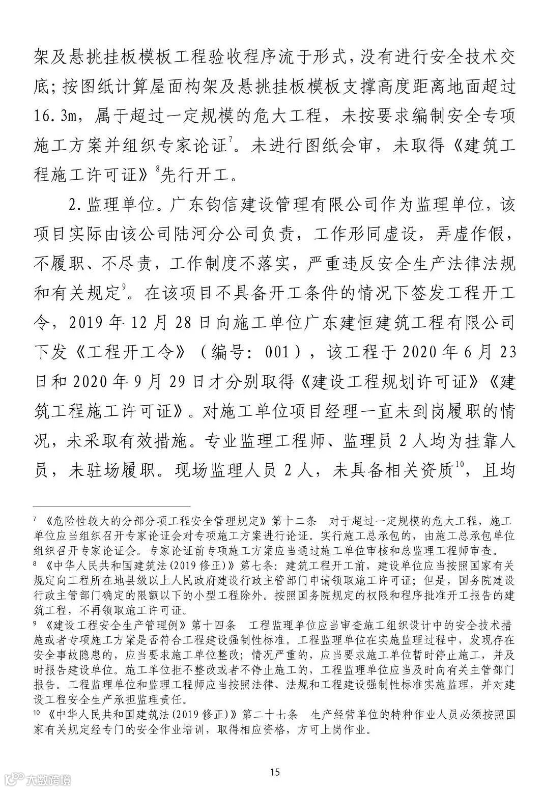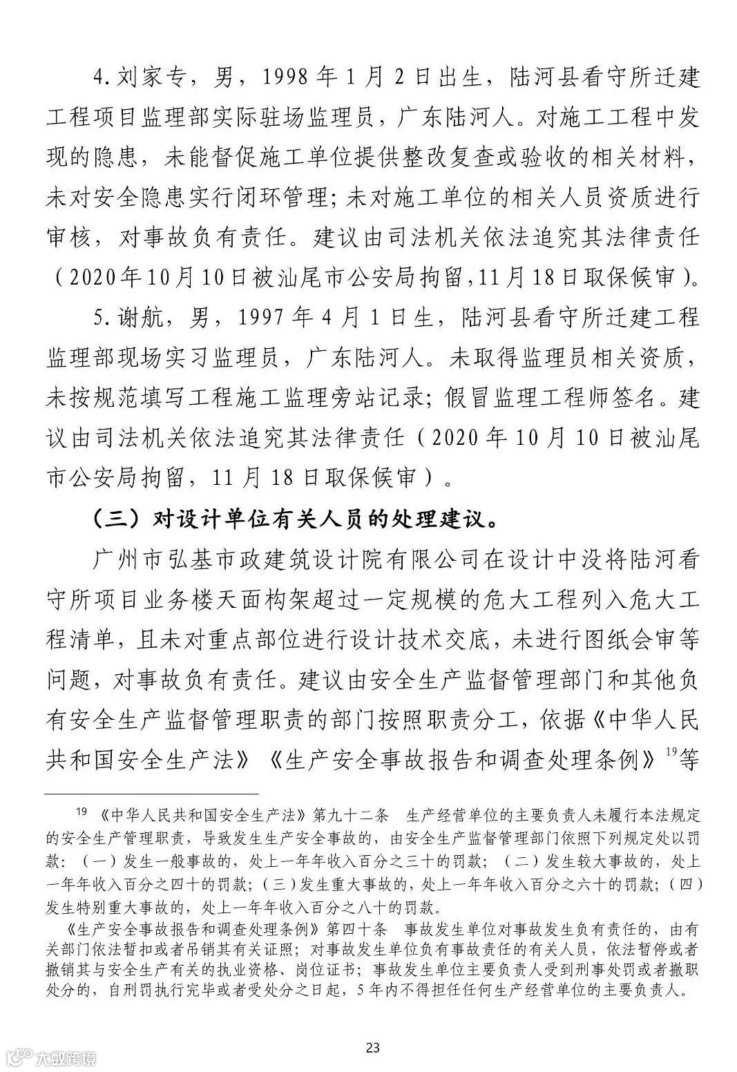 5.黄某长,男,专科文科程度,聘用的一级建造师,其明知其建造师资质及本人姓名被任命为陆河县看守所项目负责人,虽然有要求变更,但仍于聘用期届满时于2020年9月17日,再与施工单位续签聘用合同,但一直未到岗履职,对事故负有责任。建议由司 法机关依法追究其法律责任(2020 年11月17日被汕尾市检察院批准逮捕)。