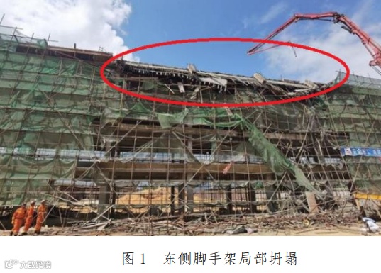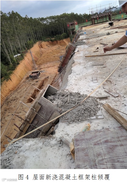 2、天面构架混凝土施工工序不当,未按要求先浇筑结构柱,待其强度达到75%及以上后再浇筑屋面构架及挂板混凝土,且未设置防止天面构架模板支撑侧翻的可靠拉撑。