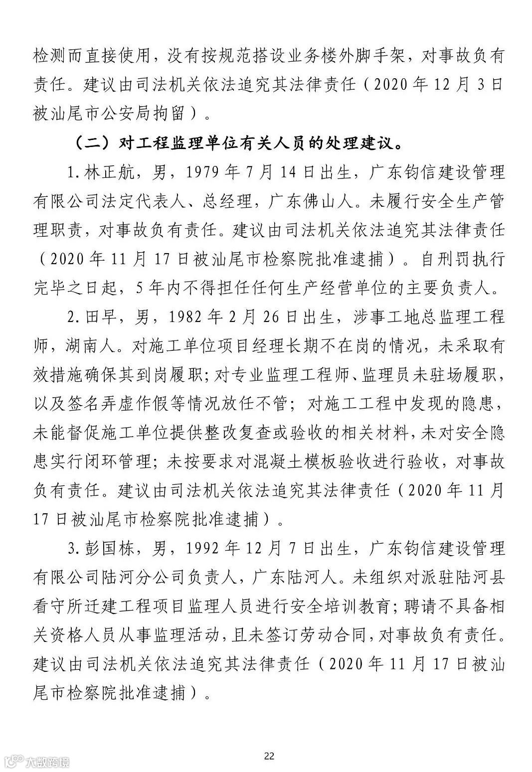 2、田某,男,涉事工地总监理工程师。建议由司法机关依法追究其法律责任(2020 年11月17日被汕尾市检察院批准逮捕)。