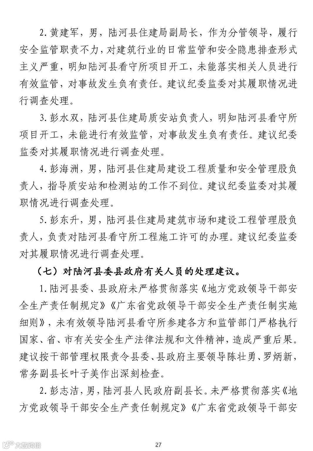 2.彭某洁,男,陆河县人民政府副县长。建议由纪委监委对其履职情况进行调查处理。