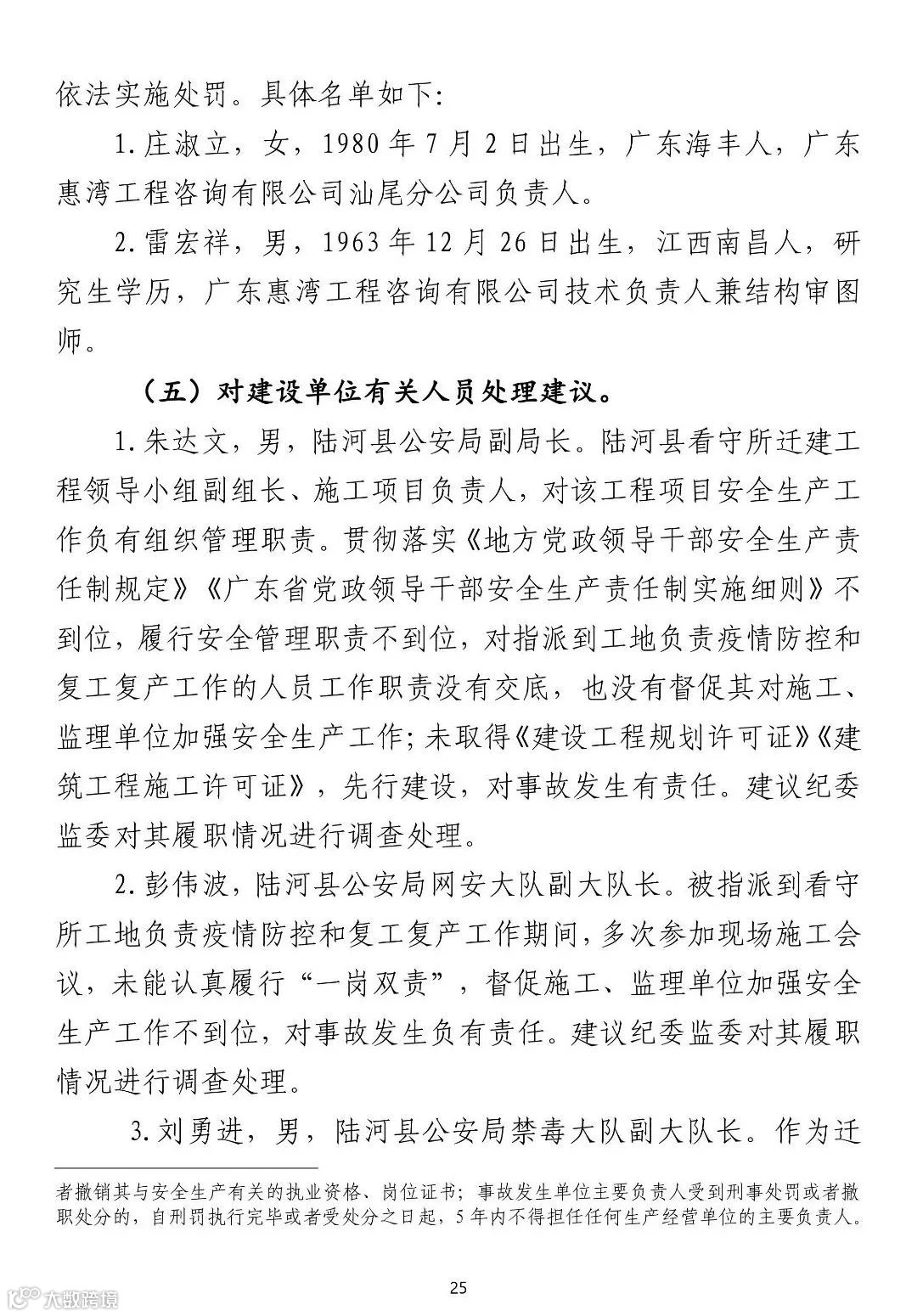 4.丘某艳,男,“包工头”杨某平聘请的陆河看守所项目施工安全员,没有持证上岗。建议由司法机关依法追究其法律责任(2020 年11月17日被汕尾市检察院批准逮捕)。