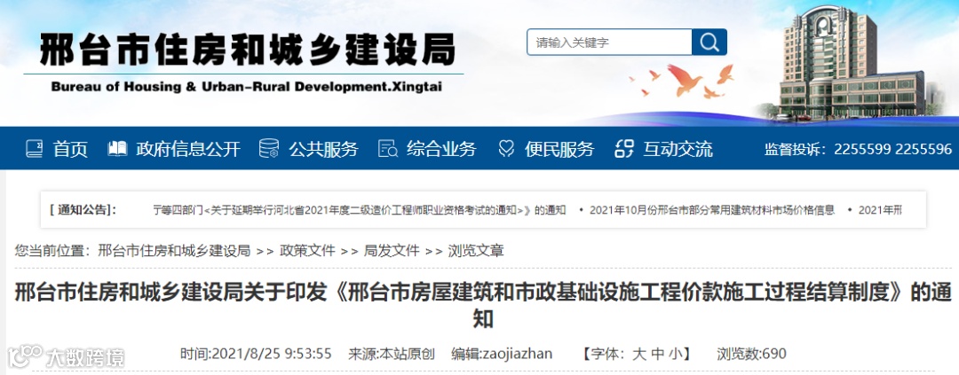 2021年8月,邢台市住建局印发《邢台市房屋建筑和市政基础设施工程价款施工过程结算制度》。