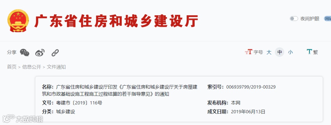 2019年6月13日,广东省住建厅印发通知,推进全省房屋建筑和市政基础设施工程施工过程结算。