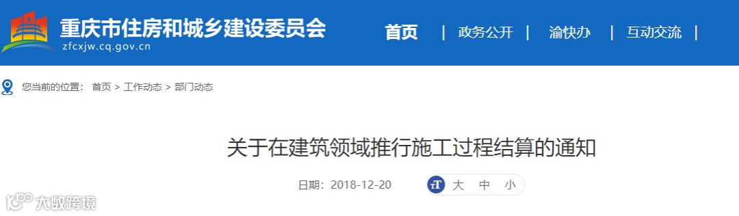 2018年12月20日,重庆市住建委发布《关于在建筑领域推行施工过程结算的通知》,要求:新开工、建设工期两年以上工程,推行施工过程结算。
