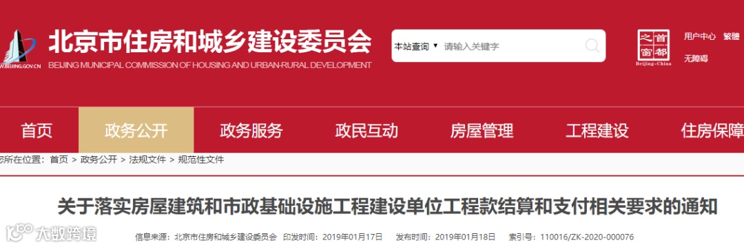 2019年1月17日,北京市住建委发布《落实房屋建筑和市政基础设施工程建设单位工程款结算和支付相关要求的通知》,其中明确指出: