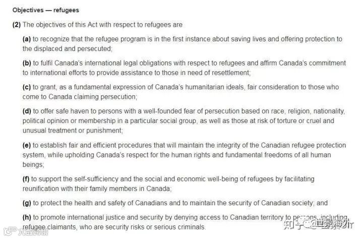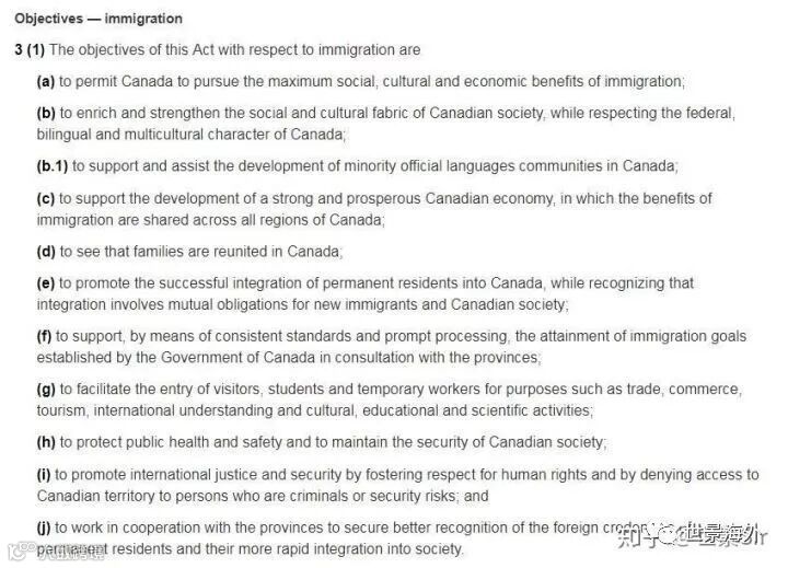 加拿大移民与难民保护法的立法初衷非常明确,在开卷之初即分两部分清晰的道明了该法的旨在达到的目标: