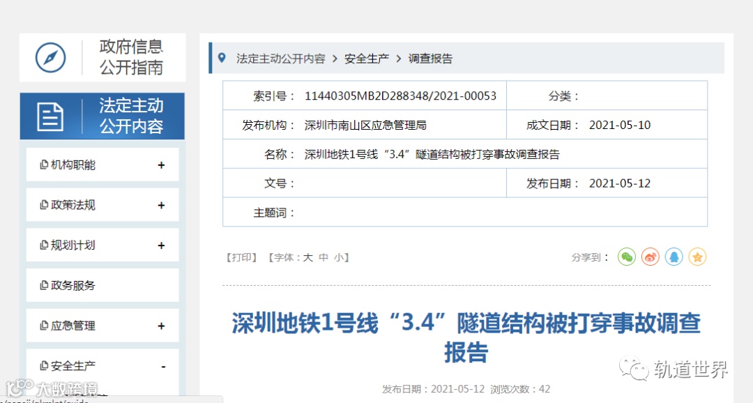日前,《深圳地铁1号线“3.4”隧道结构被打穿事故调查报告》已经区政府批复,现予公布。