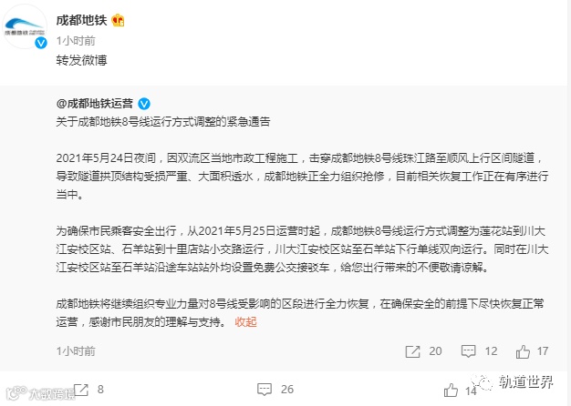 15时10分,地铁1号线0509次(178车)列车运行至深大-桃源下行区间百米标210-212处时,列车司机发现前方隧道顶部被击穿,疑似有钻头侵入,立即将情况上报。地铁运营单位随即安排后续3309次(139车)列车司机限速查看,司机确认隧道被击穿并采取紧急停车措施,列车迫停区间,运营单位按照应急预案启动应急响应。区应急管理局、区住房建设局、区城管和综合执法局、粤海街道办、南山公安分局、市公安局公交分局等部门在接报后也立刻赶到事发现场进行处置。15时20分,3309次(139车)列车退回深大站清客并启动公交接驳,专业抢修队陆续到达现场。16时38分,深圳地铁消防队将侵入隧道的钻头切除。16时58分,事发区间全线恢复运营。