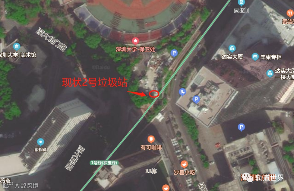 1.深圳大学2号垃圾站位于深圳大学粤海校区内深大东路南侧与深大北门路交叉、离深圳大学保卫处东南方约150米处。现状2号垃圾站是一栋单层混凝土结构建筑,地面比深大东路南侧路面低3米左右,2号垃圾站南侧一米为围墙,围墙外侧为科技南一路,科技南一路比2号垃圾站地面低8米左右(见图三)。