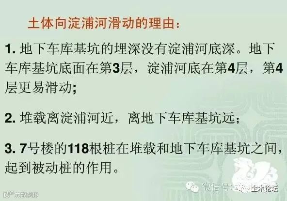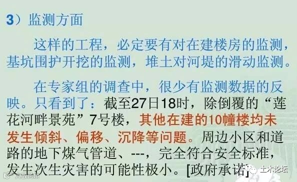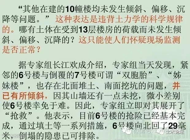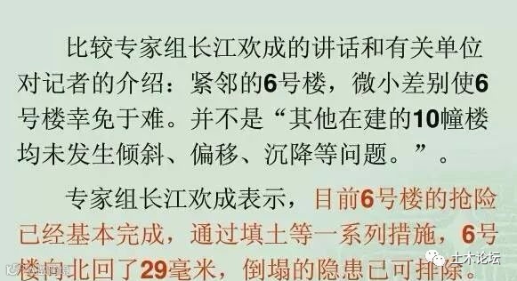 事故调查专家组组长、中国工程院院士江欢成说,事发楼房附近有过两次堆土施工:半年前第一次堆土距离楼房约20米,离防汛墙10米,高3到4米;第二次从6月20日起施工方在事发楼盘前方开挖基坑堆土,6天内即高达10米,“致使压力过大”。