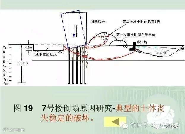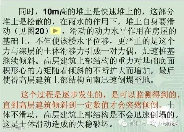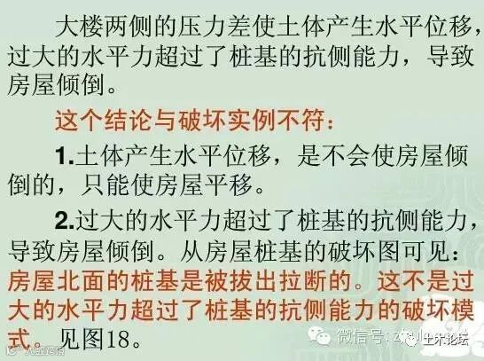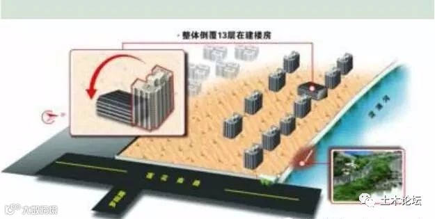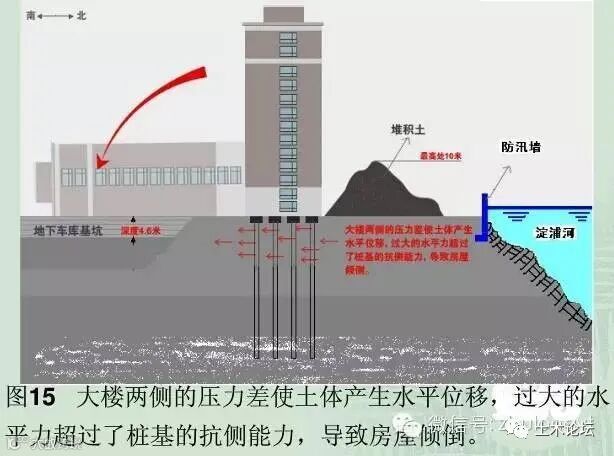 调查结果显示,倾覆主要原因是,楼房北侧在短期内堆土高达10米,南侧正在开挖4.6米深的地下车库基坑,两侧压力差导使土体产生水平位移,过大的水平力超过了桩基的抗侧能力,导致房屋倾倒。
