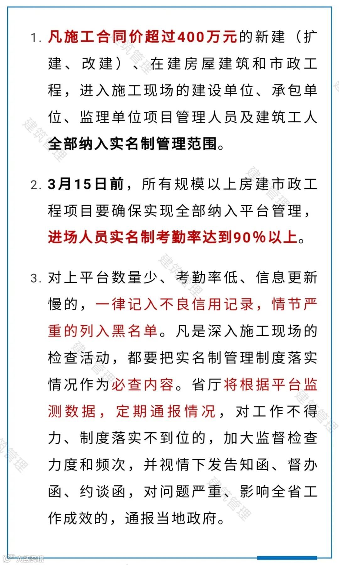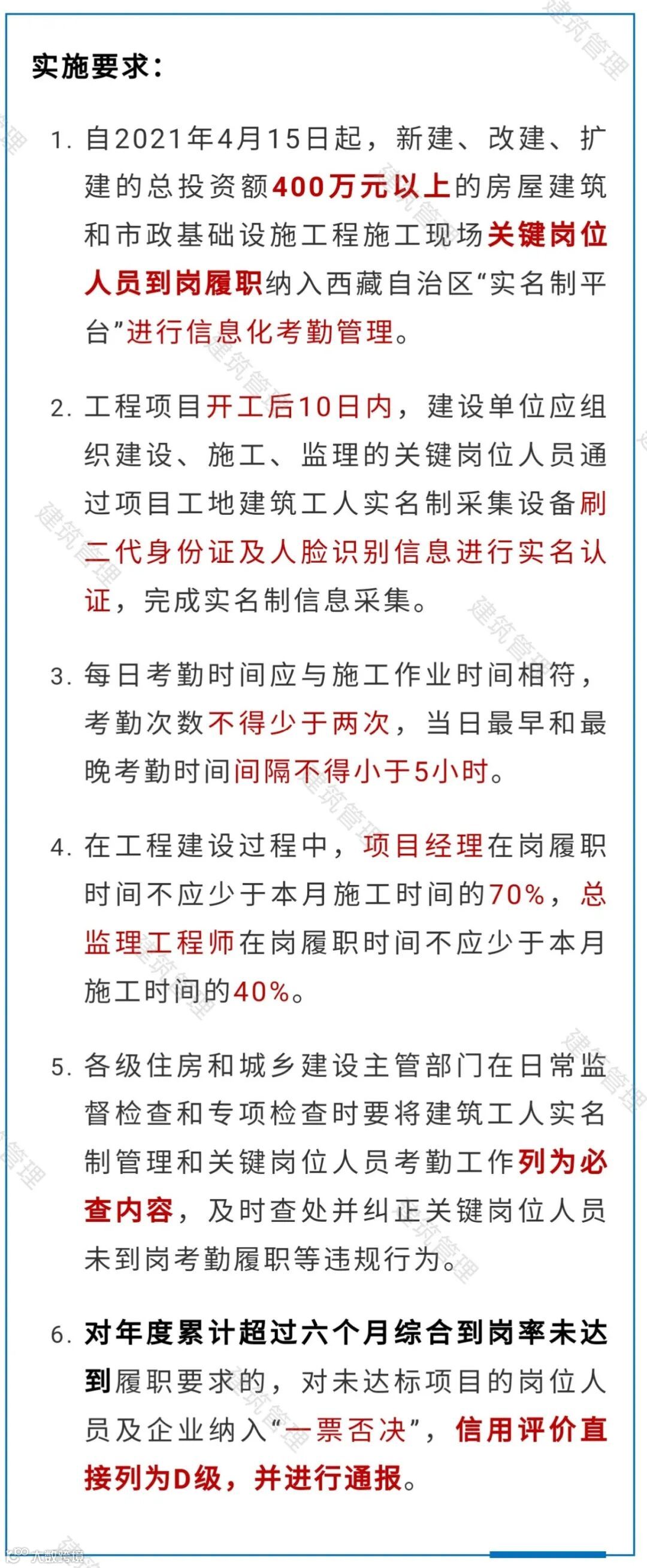 各地住房城乡建设主管部门要加强本行政区域内房屋建筑和市场基础设施项目实名制管理工作监管力度,拓展实名制人员信息录入的范围。自2021年4月1日起,凡进入施工现场的建设单位、总包单位、分包单位、监理单位、劳务企业的项目管理人员必须纳入实名制管理范围,包括总承包和分包单位管理人员(含八大员、特种作业人员等)、建设单位项目负责人员、监理单位管理人员等相关基本信息(包括相关持证上岗人员的证书类别、证书编号、有效期等);应及时修改完善建筑工人的技能等级、联系方式、银行帐号等信息,对于临时聘用人员也应纳入实名制管理之中,做到应录尽录、准确无误,相关信息完善、录入工作务必于2021年5月1日前完成。全省房屋建筑和市场基础设施项目要严格按照实名制管理要求,实行每日考勤,考勤记录将作为各地对建筑市场行为监管以及核实管理人员是否履职的重要依据,其中项目经理以及总监每月考勤记录不得低于70%。对于未按要求执行的项目,省厅将纳入预警项目清单,逾期未改正的将予以通报、处罚并扣除项目和企业对应的信用分。有条件的地区可以将本地建筑市场执法人员信息一并录入,方便执法和监管人员对项目实名制管理落实情况的督导检查,执法监督数据一并纳入实名制管理之中。