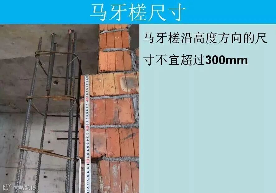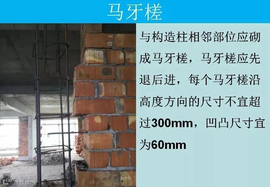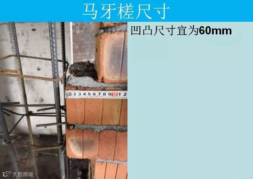 3、与构造柱相邻部位应砌成马牙槎,马牙槎应先退后进,每个马牙槎沿高度方向的尺寸不宜超过300mm,凹凸尺寸宜为60mm