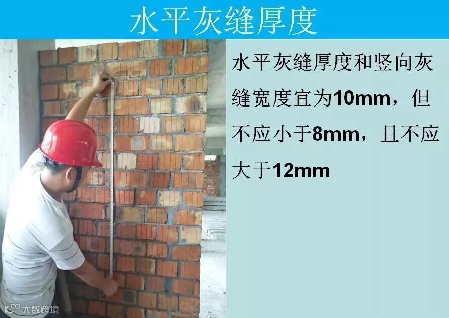 2、砖砌体的灰缝应横平竖直,厚薄均匀。水平灰缝厚度和竖向灰缝宽度宜为10mm,但不应小于8mm,且不应大于12mm