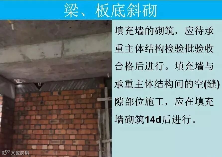 5、蒸压加气混凝土砌块填充墙砌至接近梁、板底时,应留一定空隙,待填充墙砌沉实后,采用柔性连接