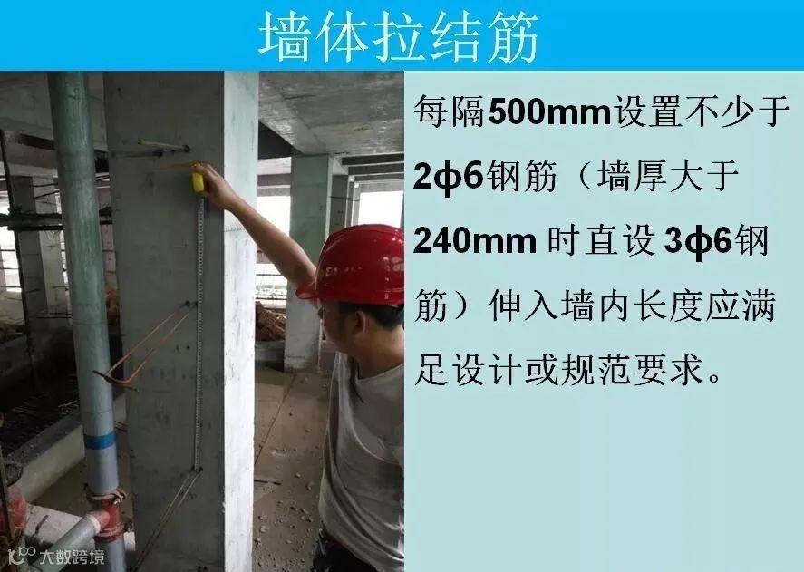 4、墙与构造柱或混凝土墙、柱,应在柱或混凝土墙内预留拉结钢筋,每隔500mm设置不少于2ф6钢筋(墙厚大于 240mm 时直设 3ф6钢筋),伸入墙内长度应满足设计或规范要求。
