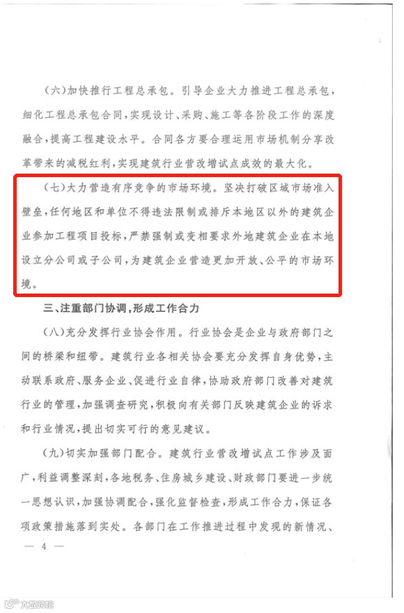 一、各级住房和城乡建设主管部门要严格执行《住房城乡建设部关于印发推动建筑市场统一开放若干规定的通知》(建市〔2015〕140号)第八条规定,不得要求或变相要求建筑企业跨地区承揽业务在当地设立分(子)公司;对于存在相关问题的,要立即整改。各级房屋建筑与市政基础设施工程招标投标监管部门要全面梳理本行政区域内房屋建筑和市政基础设施工程招标文件,清理招标文件中将投标企业中标后承诺设立分(子)公司作为评审因素等做法。
