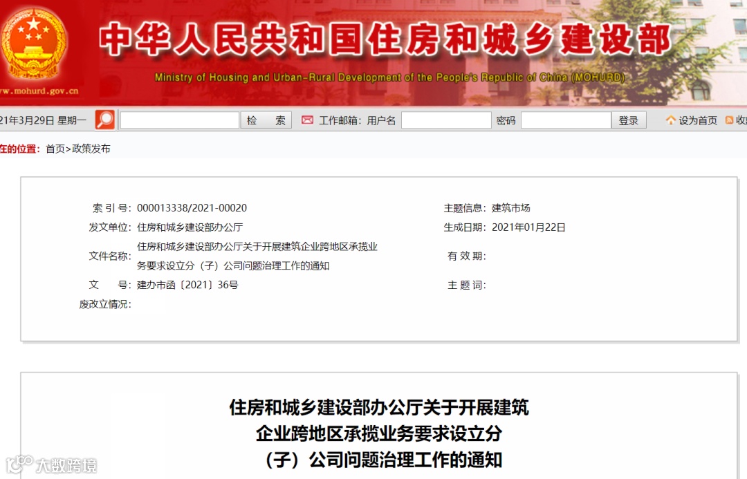 住建部发布了《关于开展建筑企业跨地区承揽业务要求设立分(子)公司问题治理工作的通知》(建办市函〔2021〕36号),在通知中再次强调了:不得要求或变相要求建筑企业跨地区承揽业务在当地设立分(子)公司。