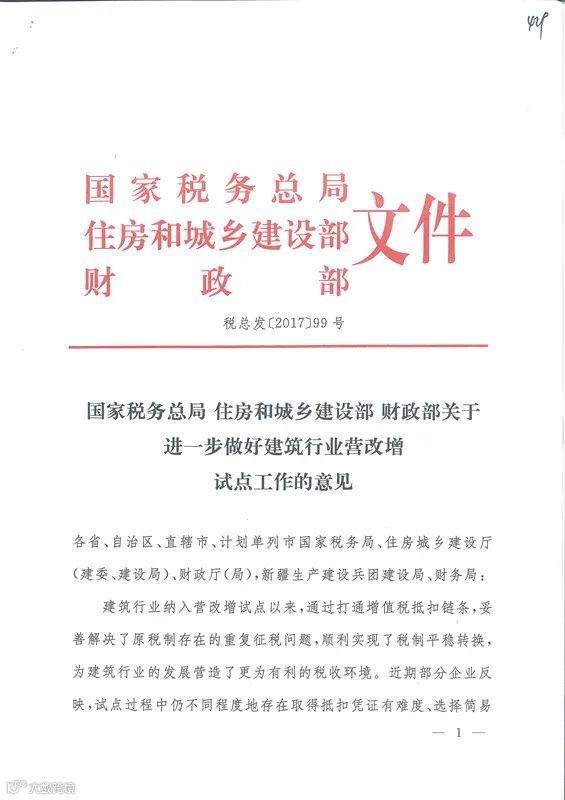 2、《财政部国家税务总局住房和城乡建设部关于进一步做好建筑行业营改增试点工作的意见》(税总发〔2017〕99号):
